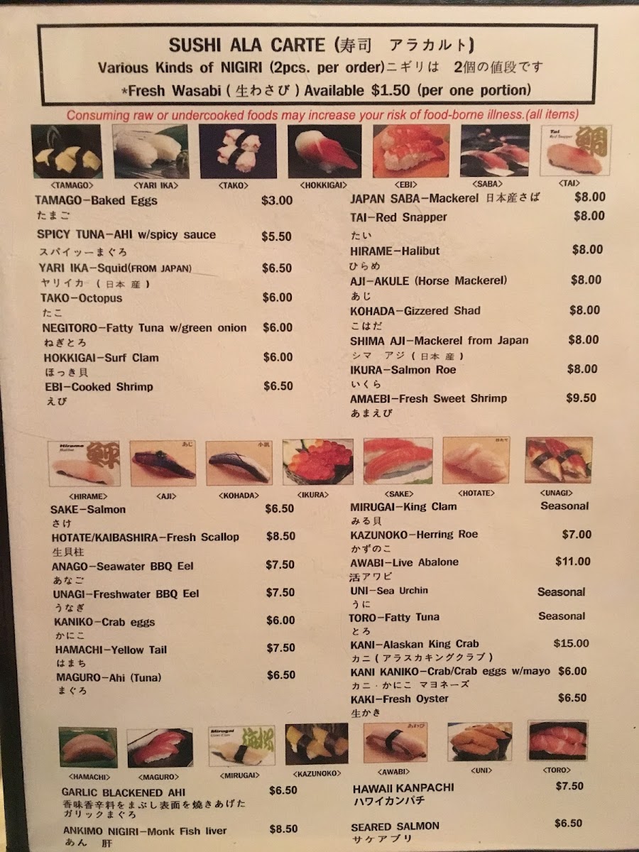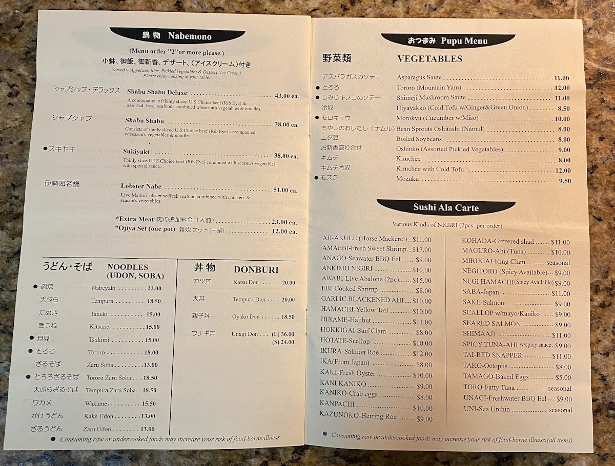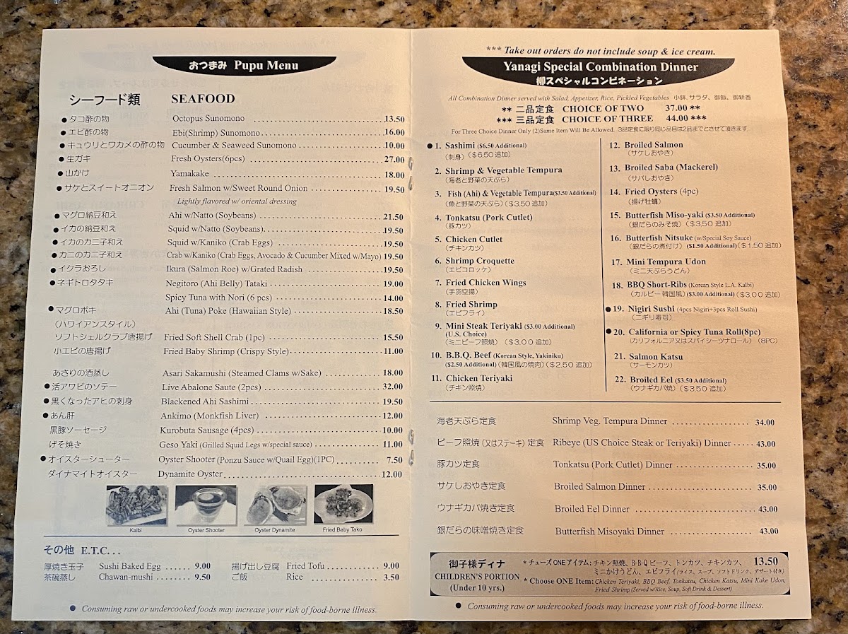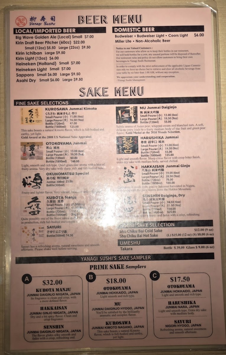 The atmosphere at Yanagi Sushi complements the menu’s style—intimate and unpretentious—making it a fitting spot for quiet meals or small group outings. The selection of unique items like Lobster Sashimi or Kaki-Fresh Oysters adds an occasional touch of variety without straying far from familiar, comforting Japanese cuisine. Whether stopping by for a late night happy hour bite or settling into a full dining experience, the menu reflects a balance of tradition and approachable flavors designed to be enjoyed at a comfortable pace.